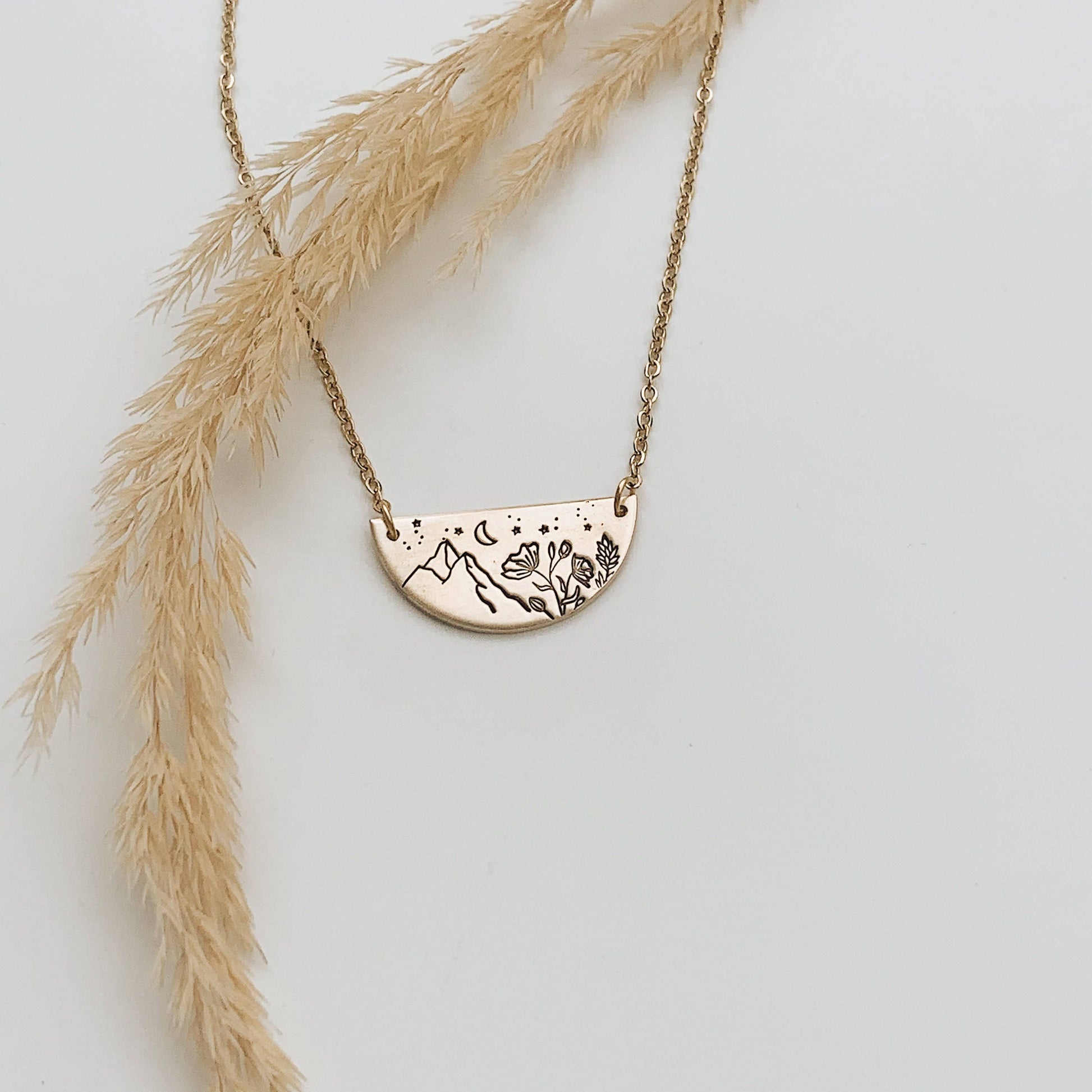 A 1" wide semi-circle is stamped with a mountain and wildflowers and starry moon night sky. The chain is set on each side of this disk. Available in NuGold or Pewter silver.